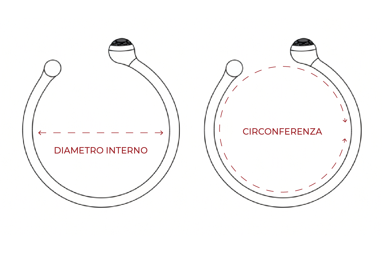 Per sapere qual’è la misura del tuo dito secondo una scala di riferimento, misura con un metro il diametro interno di un anello che già possiedi, oppure misura con un cordino o un metro da sarta la circonferenza del tuo dito e confronta i risultati che hai ottenuto con le tabelle qui sotto.